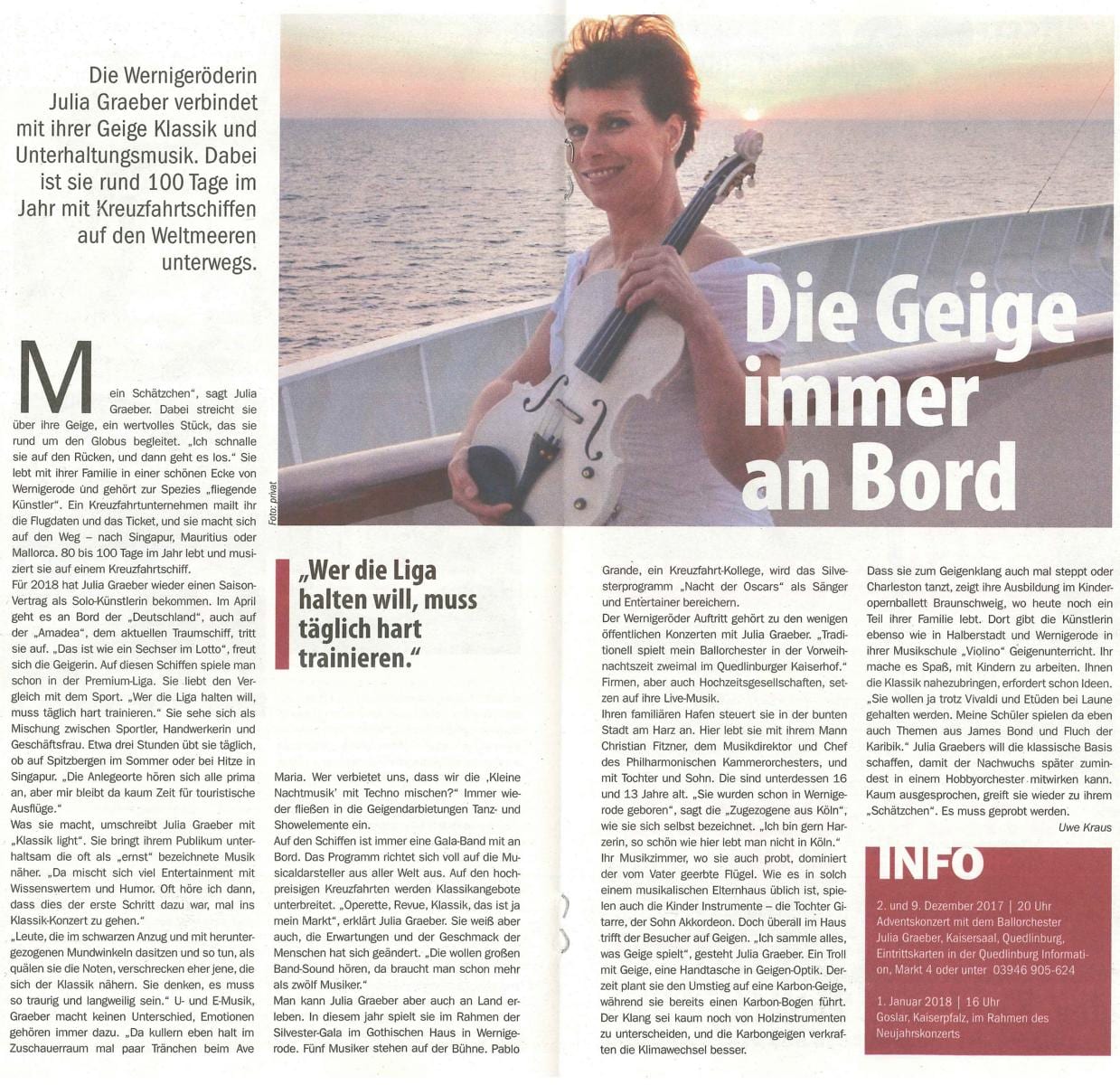 Auf der MS Deutschland und der MS Amera spielt Julia seit 2017 viele Male im Jahr ihre Solo-Shows: the great Gatsby, Celtic dreams, Traumschiff-Melodien, Eine Nacht in Venedig, Klassik light und in 80 Takten um die Welt.